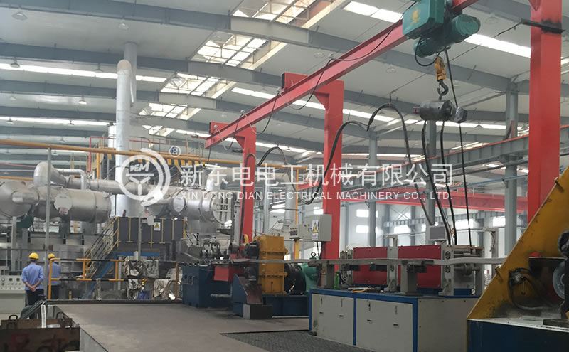 本設備采用新型四輪式連鑄機和連鑄連軋工藝生產¢9.5mm的鋁合金桿 (鋁合金牌號為1系列全部,3系列全部,6系列,8系列),鋁合金桿生產中,感應加熱器保證鑄坯進軋的工藝溫度要求,具有鑄錠加熱調節功能,連軋機具有主動喂料和堆桿停車功能,連續淬火裝置有在線淬火功能,收線導管出口處裝有吹水裝置,以清除鋁合金桿表面水分,同時安裝有主動牽引裝置,保證鋁合金桿的順利導出。圓弧導向管采用滾輪導向結構,減少鋁合金桿表面擦傷。繞桿方式為離心甩頭式,一方面使鋁合金桿在進入收線框前給予預變形;另一方面使其在軋制過程中若發生斷桿,桿尾能自動到收線框內。使其換盤時不亂桿,以保證連續雙盤成圈裝置進行收線。